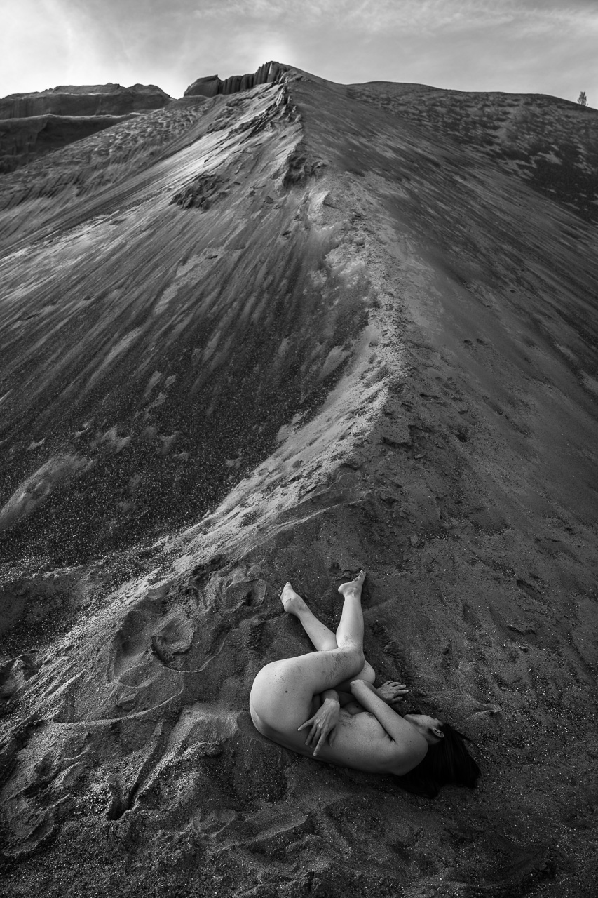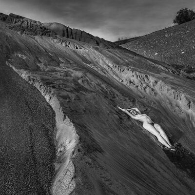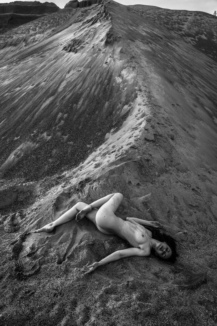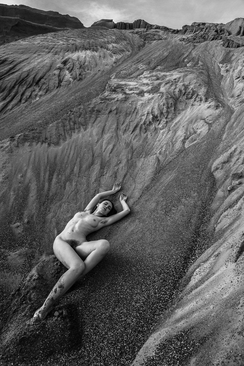 ausgezehrt, still, von einer übermächtigen Leere beherrscht. Zwischen Geröll und Staub steht der Mensch nackt und verletzlich, ein leiser Akt des Widerstands gegen die wuchtige Landschaft. Das fahle Licht zeichnet Spuren von Kampf und Durchhalten, von einem Dasein, das sich der Übermacht nicht beugt. In dieser Endzeitstimmung wird jede Bewegung zum Zeichen des Aufbegehrens – ein fragiler Körper gegen die Schwere der Welt, und doch voller stiller Entschlossenheit.