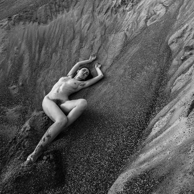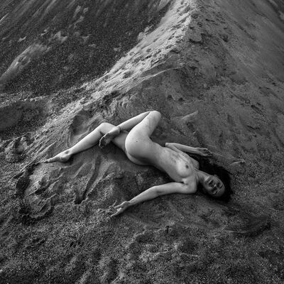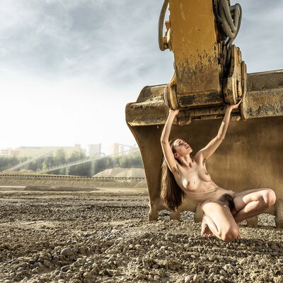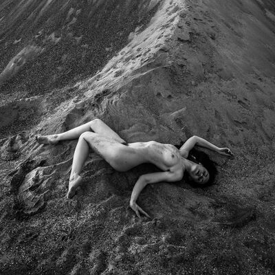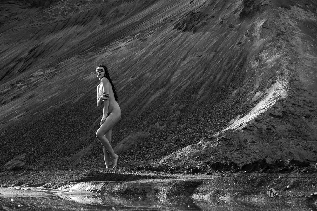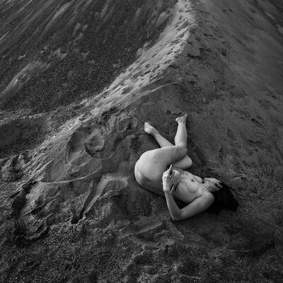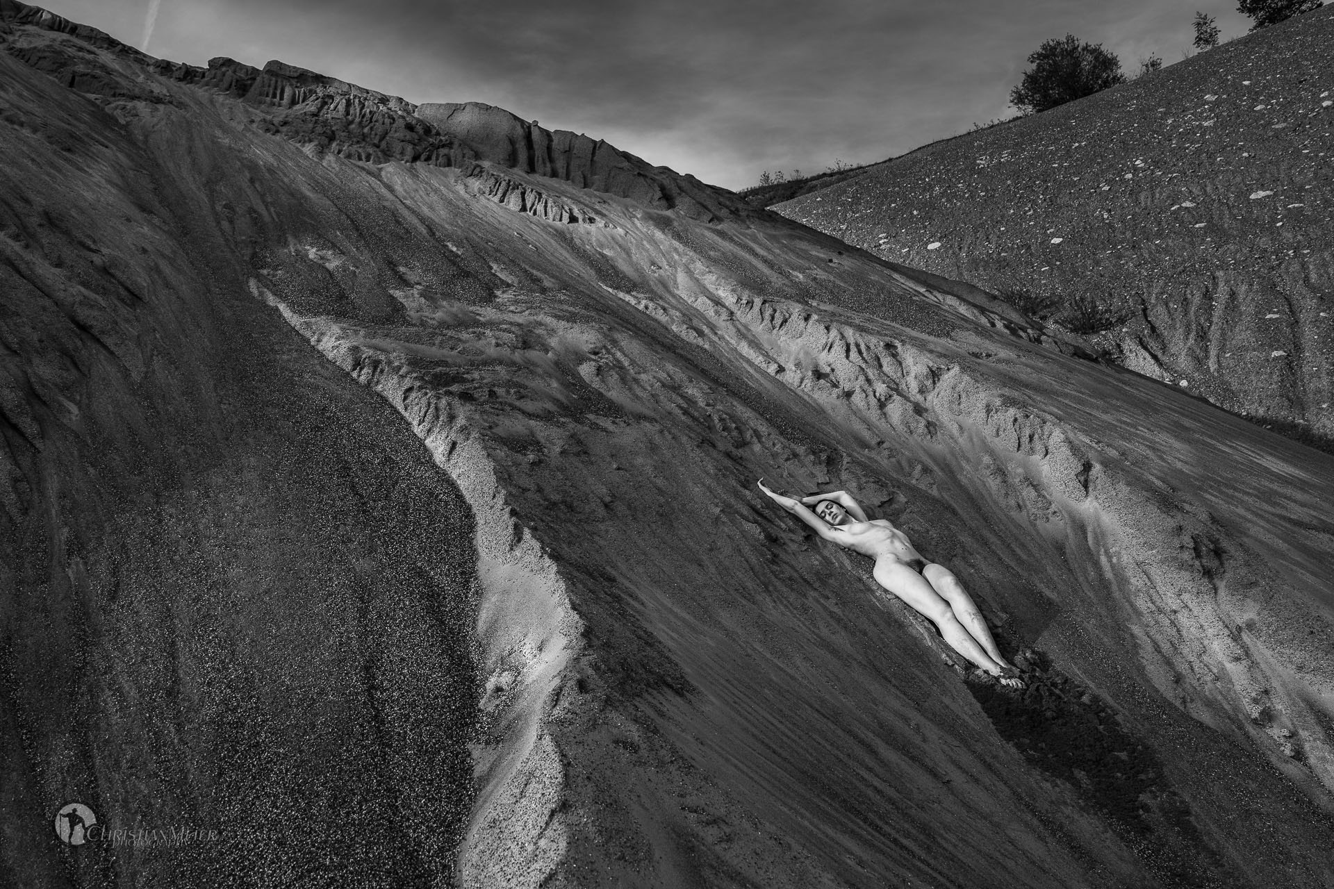 ausgezehrt, still, von einer übermächtigen Leere beherrscht. Zwischen Geröll und Staub steht der Mensch nackt und verletzlich, ein leiser Akt des Widerstands gegen die wuchtige Landschaft. Das fahle Licht zeichnet Spuren von Kampf und Durchhalten, von einem Dasein, das sich der Übermacht nicht beugt. In dieser Endzeitstimmung wird jede Bewegung zum Zeichen des Aufbegehrens – ein fragiler Körper gegen die Schwere der Welt, und doch voller stiller Entschlossenheit.